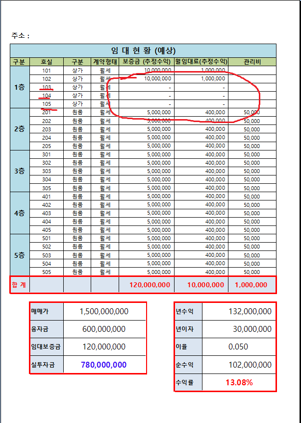1. 만약 1층에 호실이 2개 밖에 없다면 나머지 103호, 104호, 105호 호실에 적혀있는 금액을 0 이라고 입력하시면 됩니다.