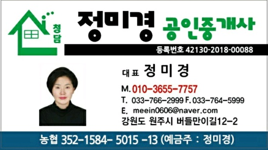 이상으로 현재는 원주에 기반을 두고 있는 원주부동산 청담 정미경부동산의 정미경 공인중개사였습니다.